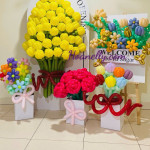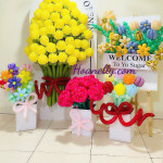 Đồng thời combo trang trí còn kèm theo chậu hoa hồng, hoa cúc, hoa tulip đủ màu sắc làm cho không gian trở nên tương sáng, tạo được nhiều góc check in cho khách hàng.