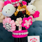 - Thiết kế: Bó hoa bóng bay được thiết kế với hình ảnh một cô bé búp bê xinh xắn ở trung tâm, xung quanh là những đám mây tròn xoe đáng yêu và một chiếc cầu vồng nhiều màu sắc. Toàn bộ bó hoa được sắp xếp hài hòa, tạo cảm giác tươi vui và trẻ trung.